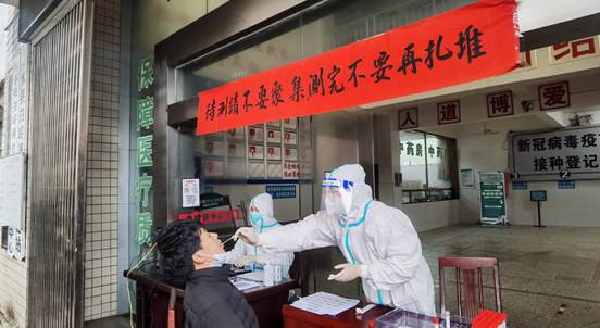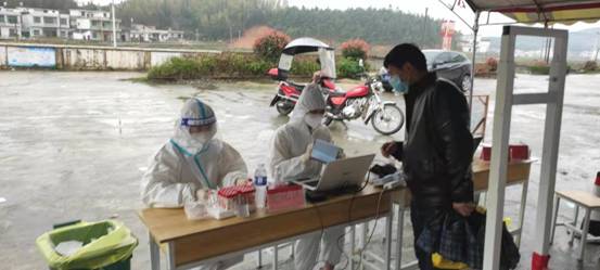3月25日,在修水县白岭镇荣春村的核酸检测点,2020届省委组织部选调生、白岭镇荣春村委会主任助理温慧正穿着防护服,协助医护人员开展村民核酸检测登记。