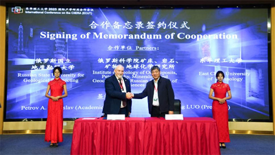 开幕式上,东华理工大学与俄方科研机构签署合作备忘录,罗仙平与Petrov A. Vladislav院士共同完成签约。该协议标志着双方将在联合科研、人才培养与学术交流等方面开启新阶段合作。