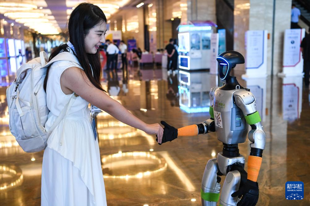 8月28日,参会人员在2025中国国际大数据产业博览会开幕式现场与一款机器人互动。